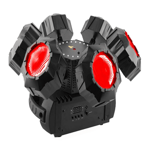 Helicopter Q6 is a multi-effect effect light designed to dazzle and energize the dance floor. It features adjustable RGBW beams, a round SMD strobe and a red/green pattern laser on a rotating base with continuous pan rotation creating unique and amazing effects. Its narrow, razor-sharp beams of RGBW light create astonishing aerial effects and the rotating red and green laser produces thousands of razor sharp beams that cover a large area. Helicopter Q6 is easy to control using automated and sound-activated programs, master/slave, DMX or an optional IRC-6 remote.